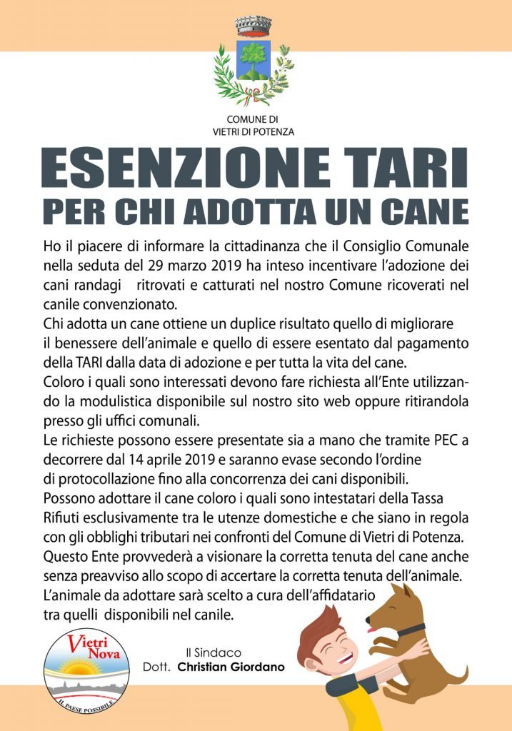Il Consiglio Comunale ha inteso incentivare l’adozione dei cani randagi ricoverati presso il canile convenzionato. Coloro i quali adotteranno un cane avranno l’esenzione dal pagamento della TARI per tutta la durata della vita dell’animale.