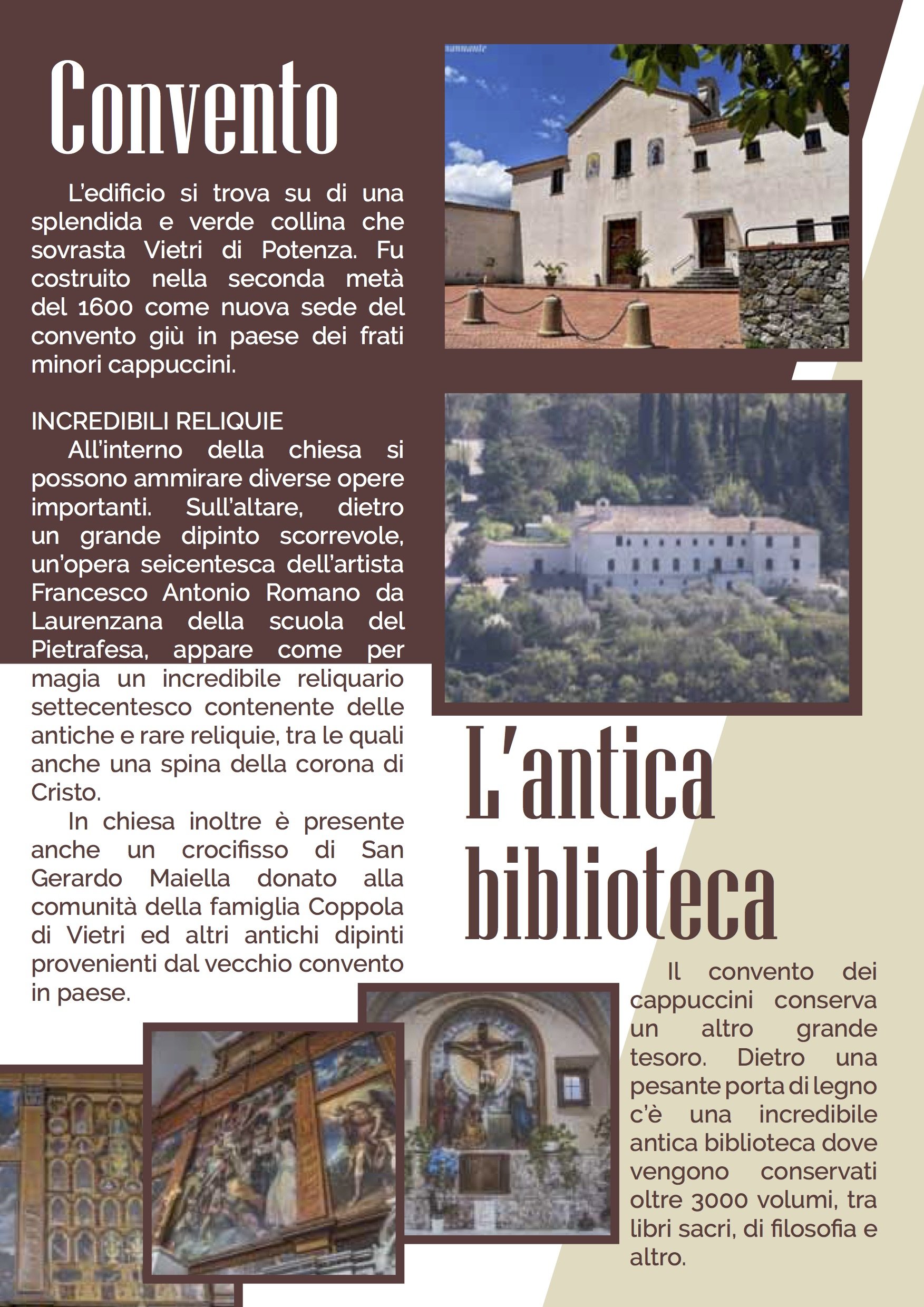 L’edificio si trova su di una splendida e verde collina che sovrasta Vietri di Potenza. Fu costruito nella seconda metà del 1600 come nuova sede del convento giù in paese dei frati minori cappuccini.