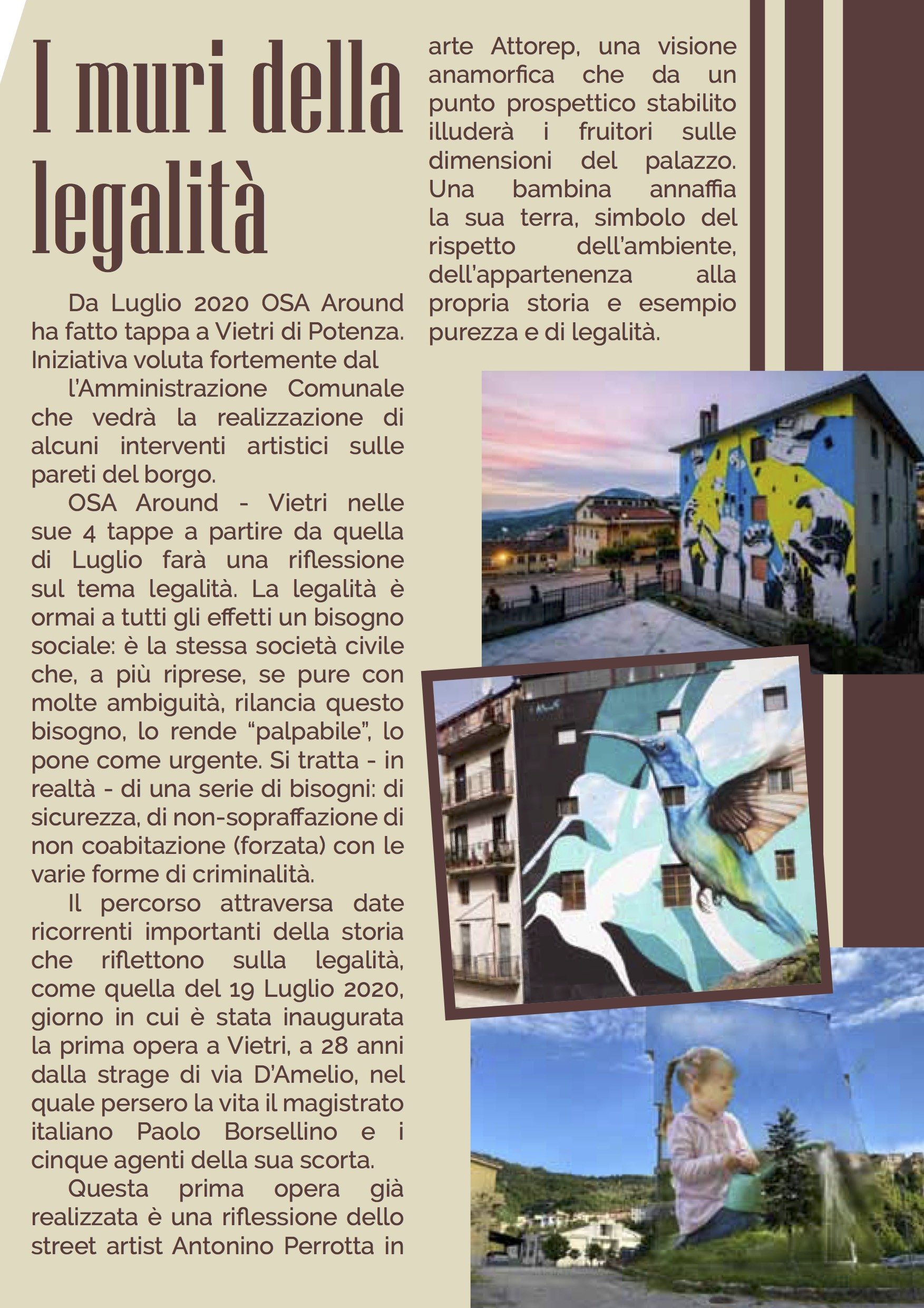 Da Luglio 2020 OSA Around ha fatto tappa a Vietri di Potenza. Iniziativa voluta fortemente dal l’Amministrazione Comunale che vedrà la realizzazione di alcuni interventi artistici sulle pareti del borgo. OSA Around – Vietri nelle sue 4 tappe a partire da quella di Luglio farà una riflessione sul tema legalità. La legalità è ormai a tutti gli effetti un bisogno sociale: è la stessa società civile che, a più riprese, se pure con molte ambiguità, rilancia questo bisogno, lo rende “palpabile”, lo pone come urgente. Si tratta – in realtà – di una serie di bisogni: di sicurezza, di non-sopraffazione di non coabitazione (forzata) con le varie forme di criminalità. Il percorso attraversa date ricorrenti importanti della storia che riflettono sulla legalità, come quella del 19 Luglio 2020, giorno in cui è stata inaugurata la prima opera a Vietri, a 28 anni dalla strage di via D’Amelio, nel quale persero la vita il magistrato italiano Paolo Borsellino e i cinque agenti della sua scorta. Questa prima opera già realizzata è una riflessione dello street artist Antonino Perrotta in arte Attorep, una visione anamorfica che da un punto prospettico stabilito illuderà i fruitori sulle dimensioni del palazzo. Una bambina annaffia la sua terra, simbolo del rispetto dell’ambiente, dell’appartenenza alla propria storia e esempio purezza e di legalità.